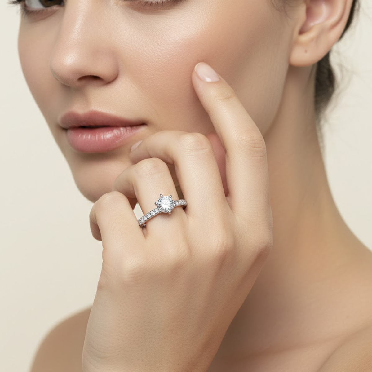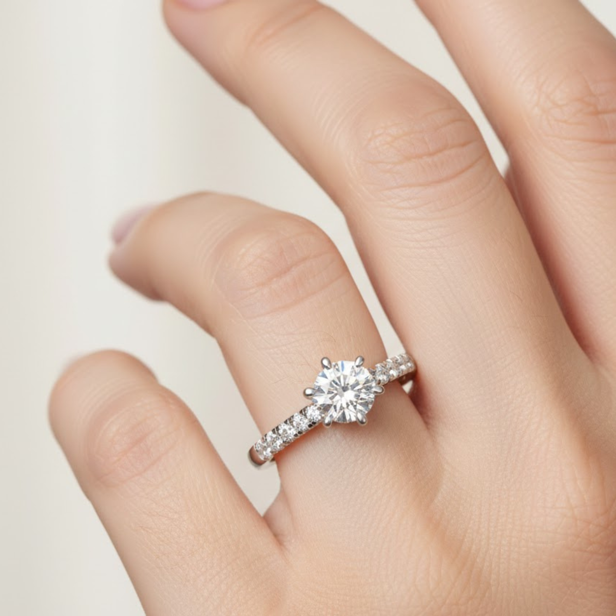 The single-row uniform shoulders are delicately micro-set with diamonds, adding a refined line of sparkle that complements the solitaire without overpowering it. Designed for comfort and everyday wear, the smooth band and balanced proportions create a flawless fit on the hand. Available in Rose Gold, Yellow Gold, White Gold, and Platinum, this ring is an ideal choice for those who appreciate classic elegance, thoughtful craftsmanship, and enduring sophistication in a modern engagement ring