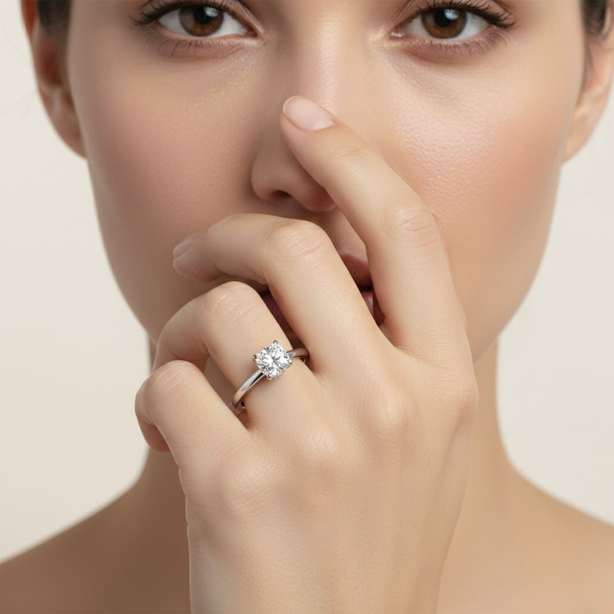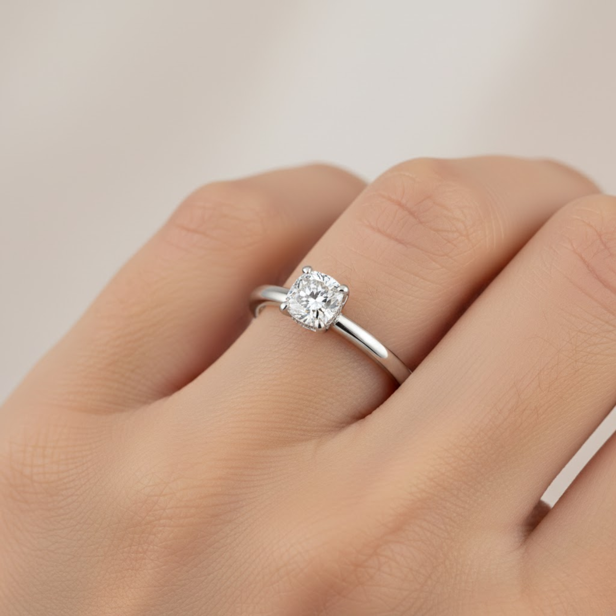 The Cushion High-Set V-Claw Solitaire showcases the refined beauty of a cushion or Asscher-cut diamond with a design focused on height, brilliance, and elegance. The center stone is held securely in a classic 4-claw V-claw setting, lifting the diamond slightly higher to catch and reflect more light, creating a bright and captivating presence.