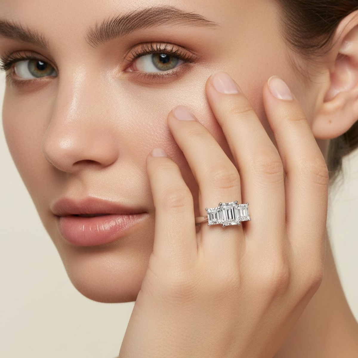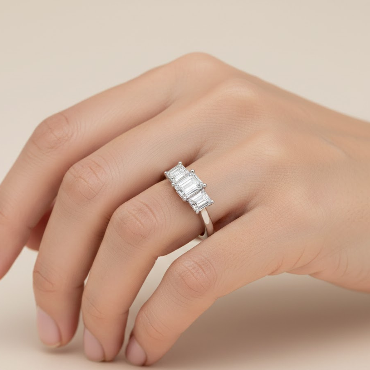 The Elaris Emerald Three-Stone Tapered Band Ring is a timeless expression of balance and sophistication. Featuring a striking emerald-cut centre stone flanked by two perfectly matched emerald-cut side stones, this three-stone design highlights clean lines and elegant symmetry. Each stone is held securely in a classic 4-claw standard setting, allowing the step-cut facets to reflect light beautifully while maintaining a strong, architectural presence on the hand.