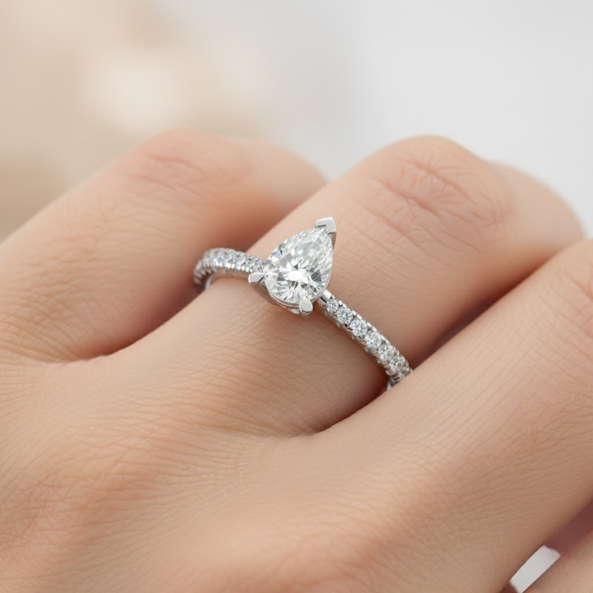 • Pear-shaped center stone in a secure specialty claw setting