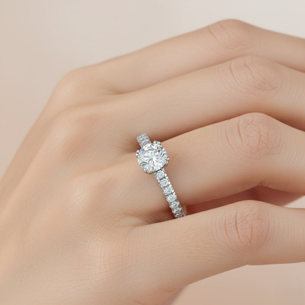he Round Fit Pavé Shoulder Solitaire is designed to highlight the natural brilliance of its round center diamond. Set in a refined 4-claw setting with double claws, the center stone is securely held while maintaining a delicate and elegant appearance. The band features a single uniform row of micro-set diamonds, adding a smooth line of sparkle that enhances the ring without overpowering its classic solitaire style.